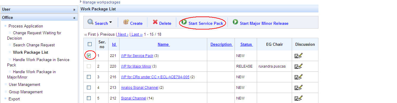 Under Office, menu entry Process Application / Work Package List, Office selects the desired work package by checking the box in front of it and presses button Start Service Pack: