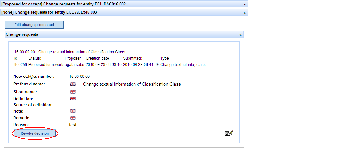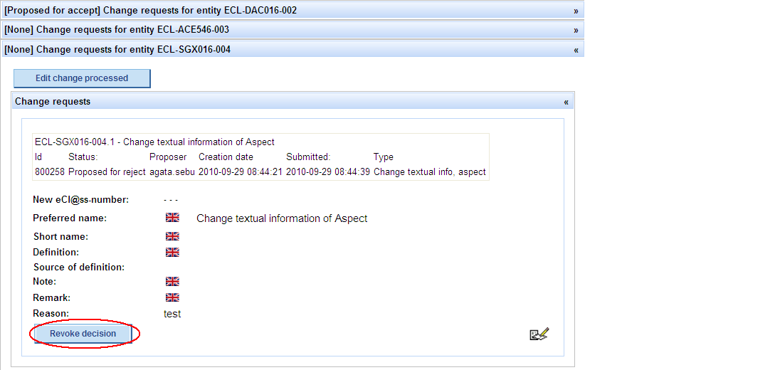 After performing this operation, the user still has the possibility to change his mind and accept/propose CR for reject by pressing button „Revoke decision“: