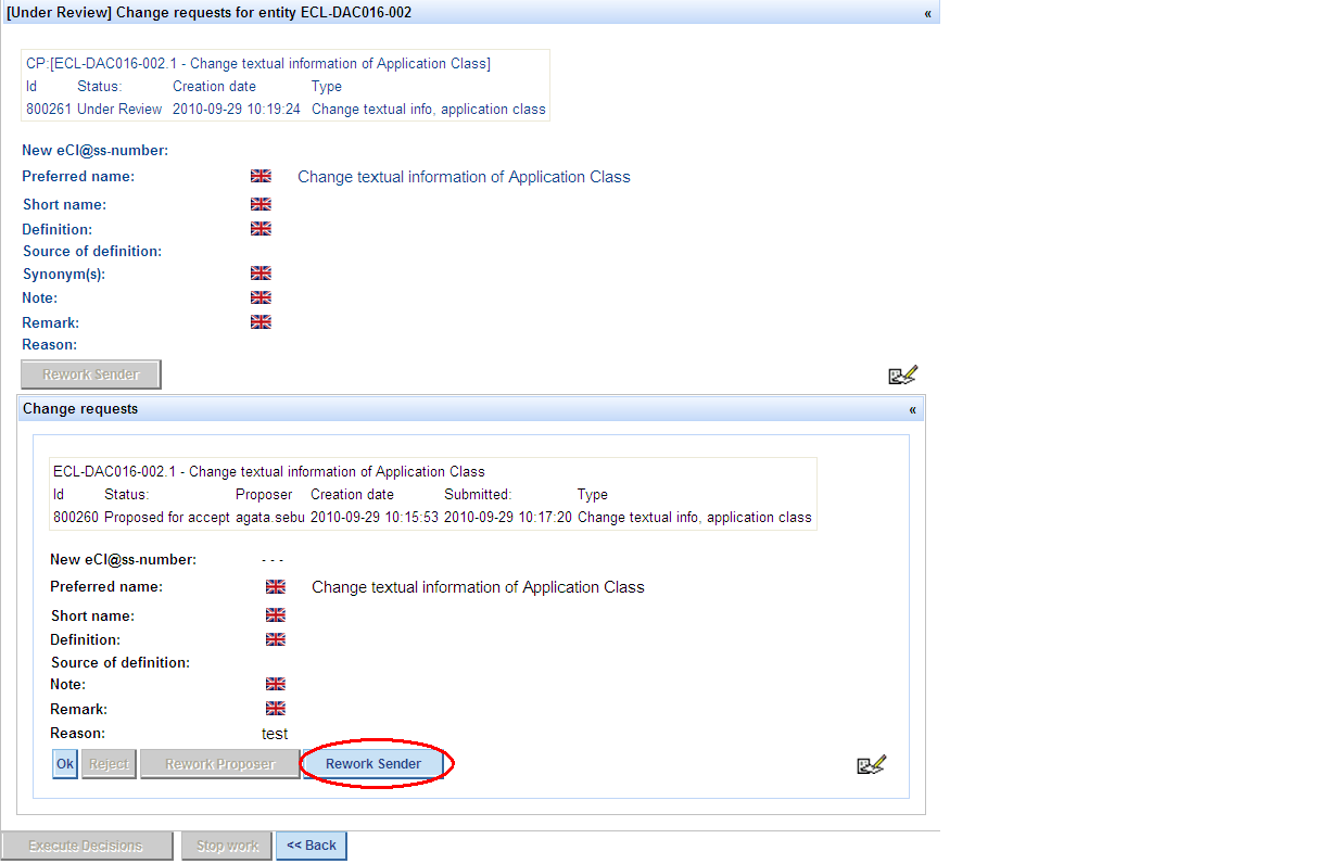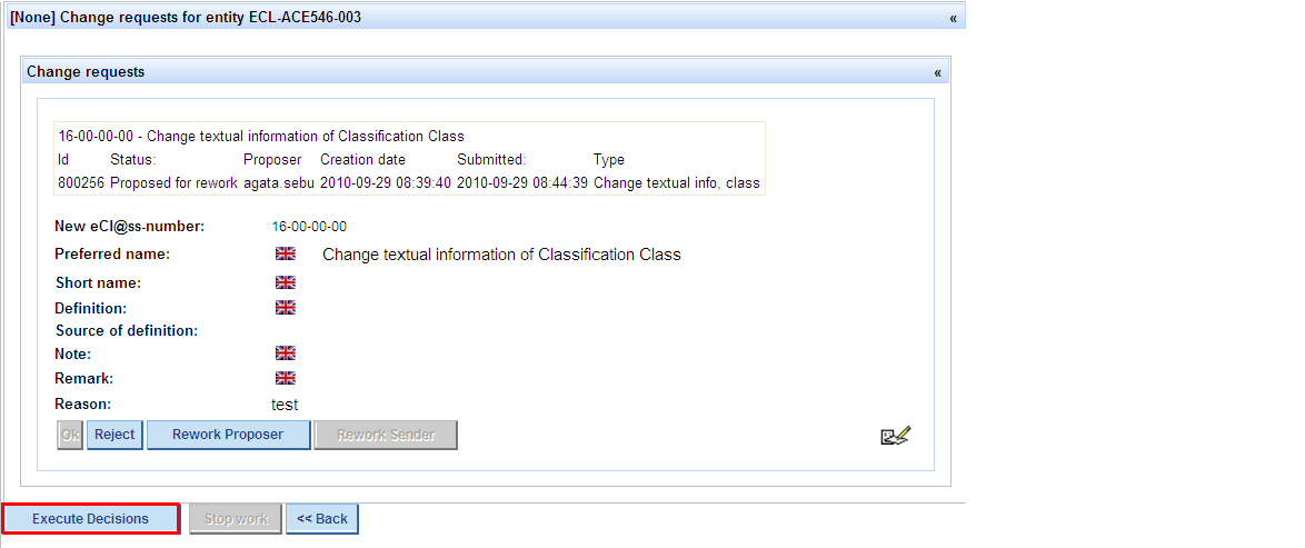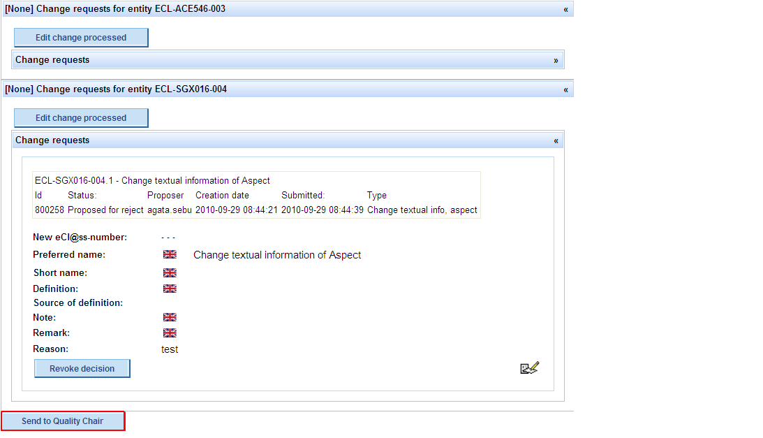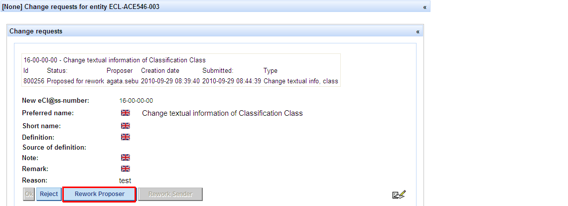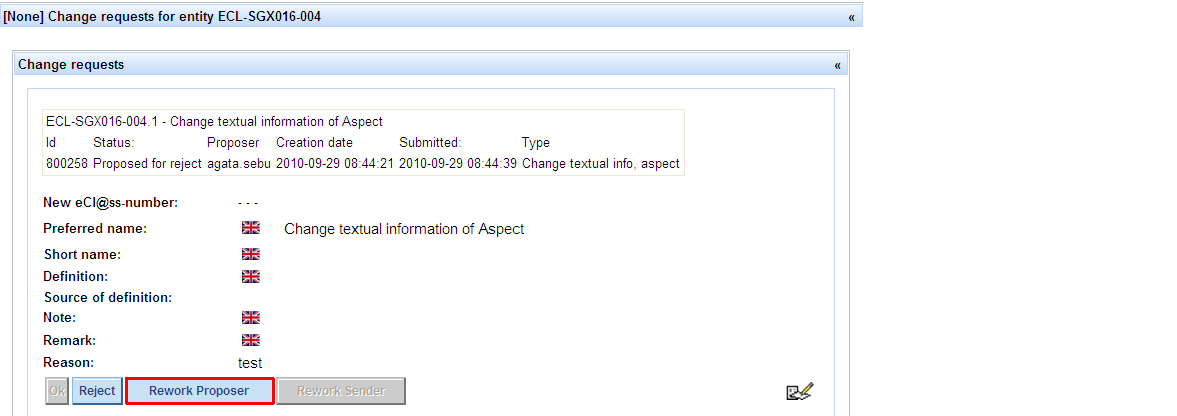 - QG Chair does not agree that the CR should be rejected and wants to send the CR back to the user (proposer), so that the latter can rework it – QG chair presses button Rework Proposer, the CR bill be sent back to the user and will appear in the list of “My change requests” in status Rework; CR will be removed from WP