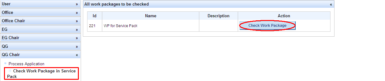 Under QG Chair, select menu entry Check Work Package in Service Pack -> a list containing all work packages to be checked is displayed