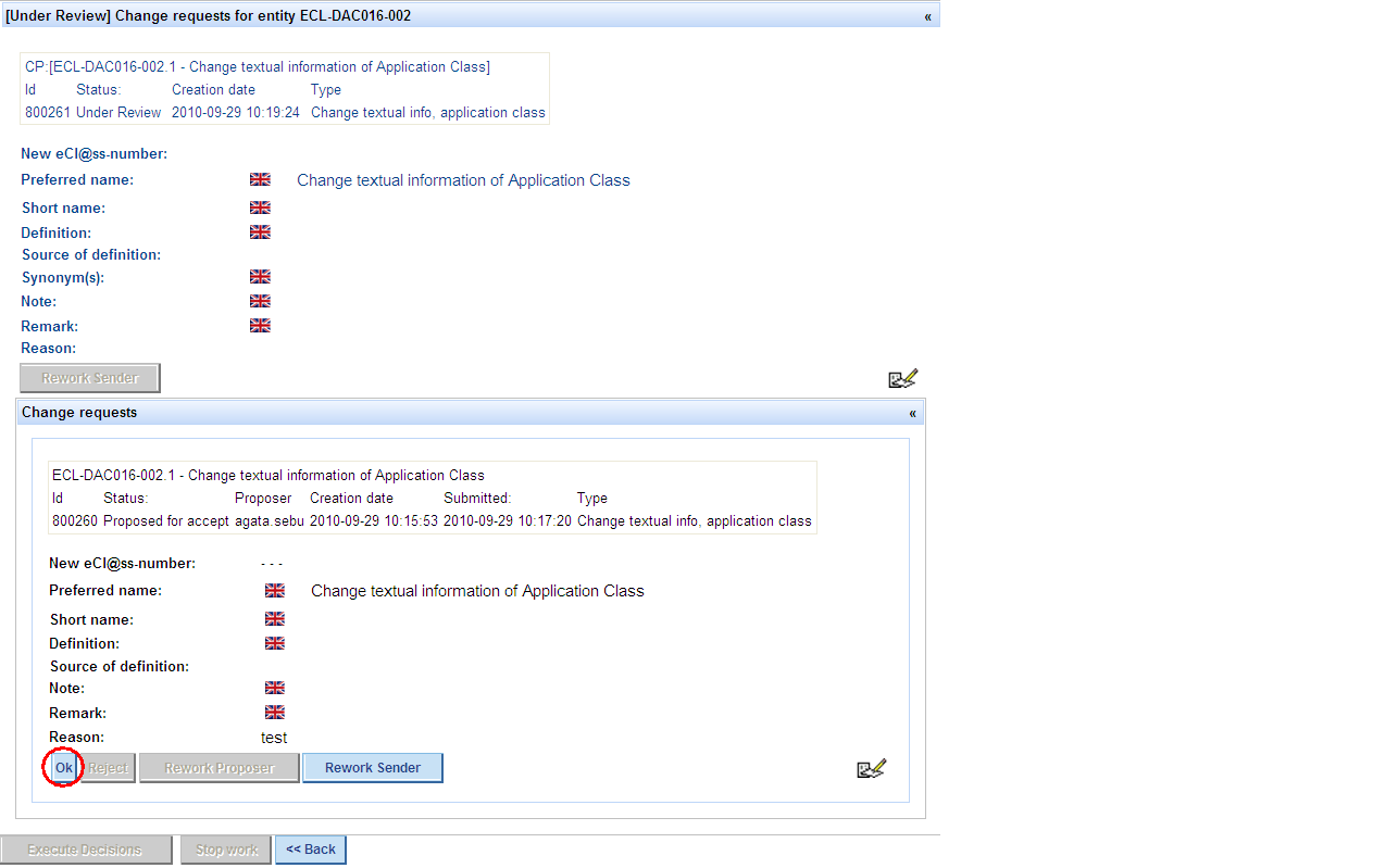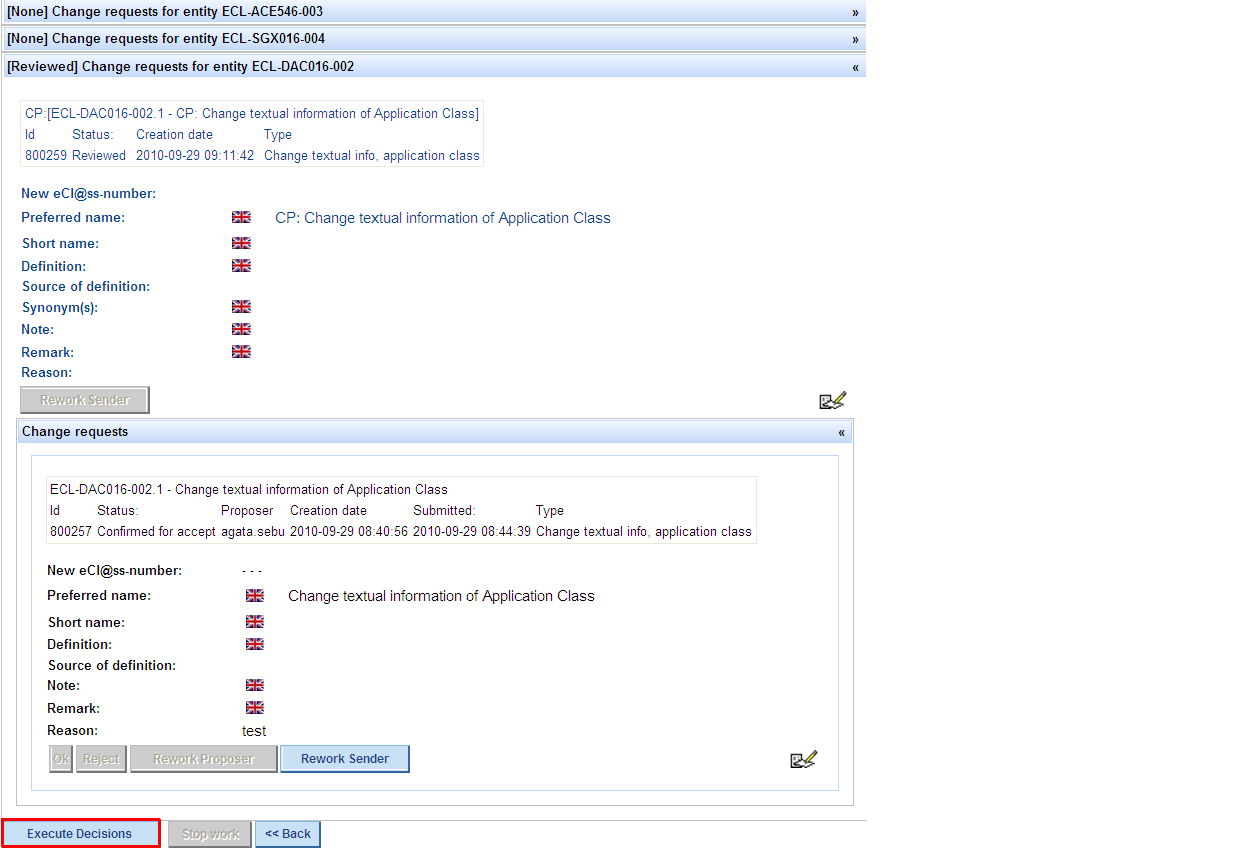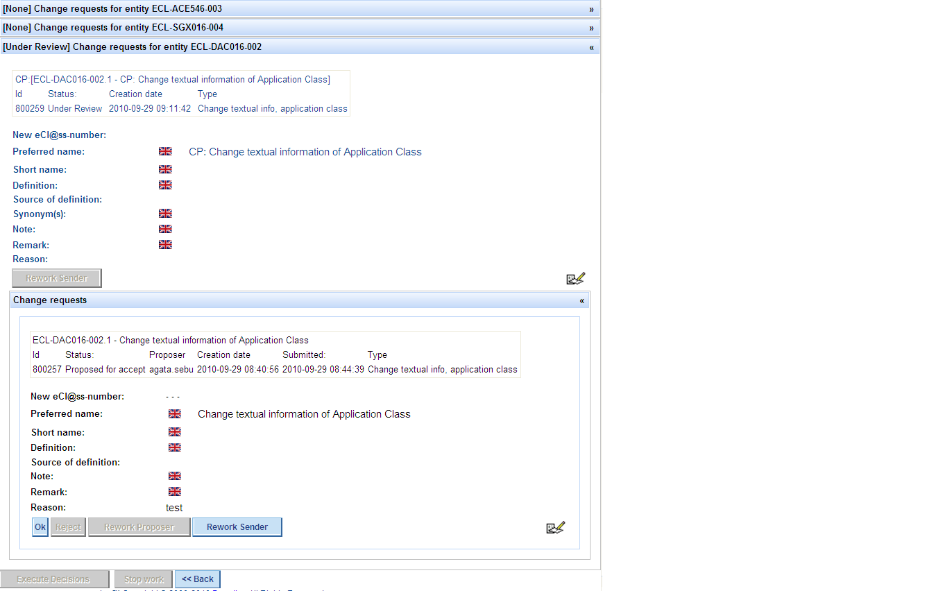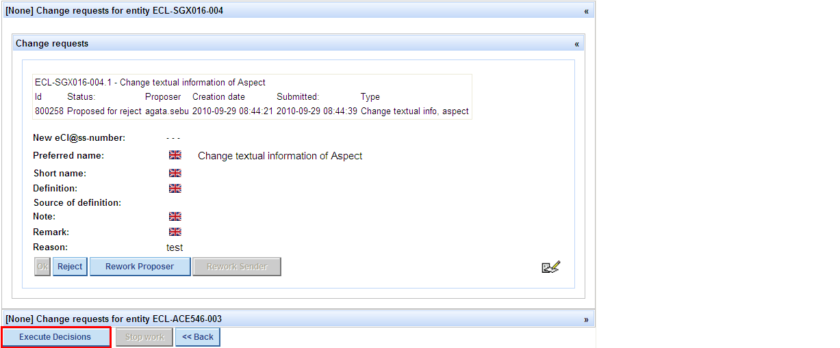 * After pressing button „Revoke decision“ and entering a reason, buttons Propose for reject, Propose for rework become active again.