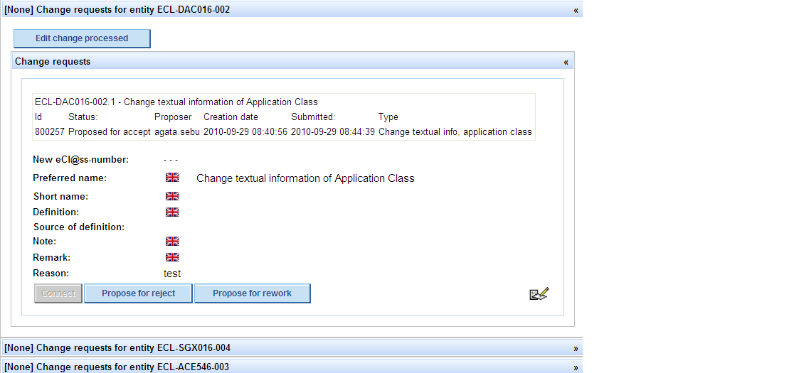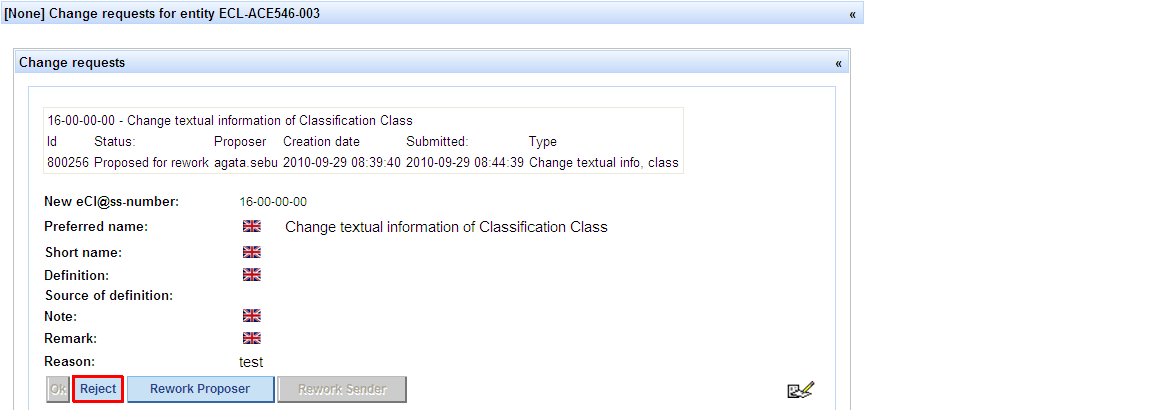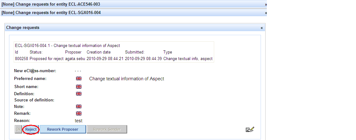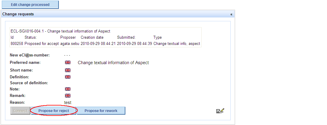 Propose CR for reject -> press button Propose for reject in order to propose the Change Request to be rejected
