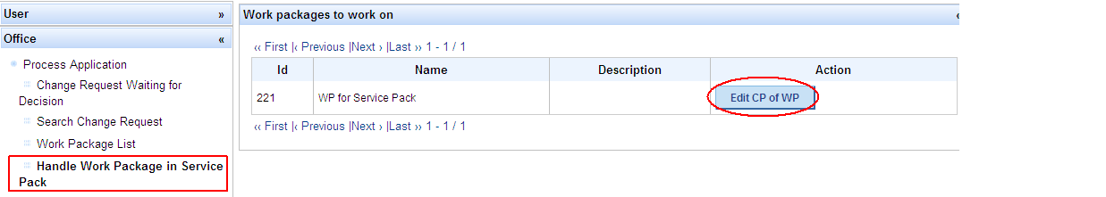 Under Office, menu entry Process Application / Handle Work Package in Service Pack -> List of work packages to work on is displayed -> press button Edit CP of WP