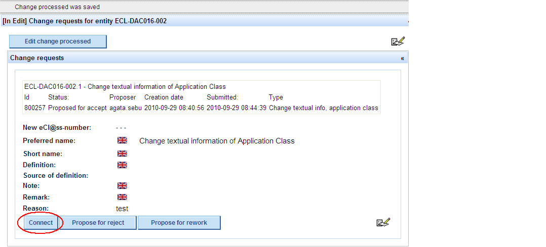 Connect CR to CP (if Office considers that the CR should be accepted) -> press button Connect in order to Connect the Change Request to the Change Processed