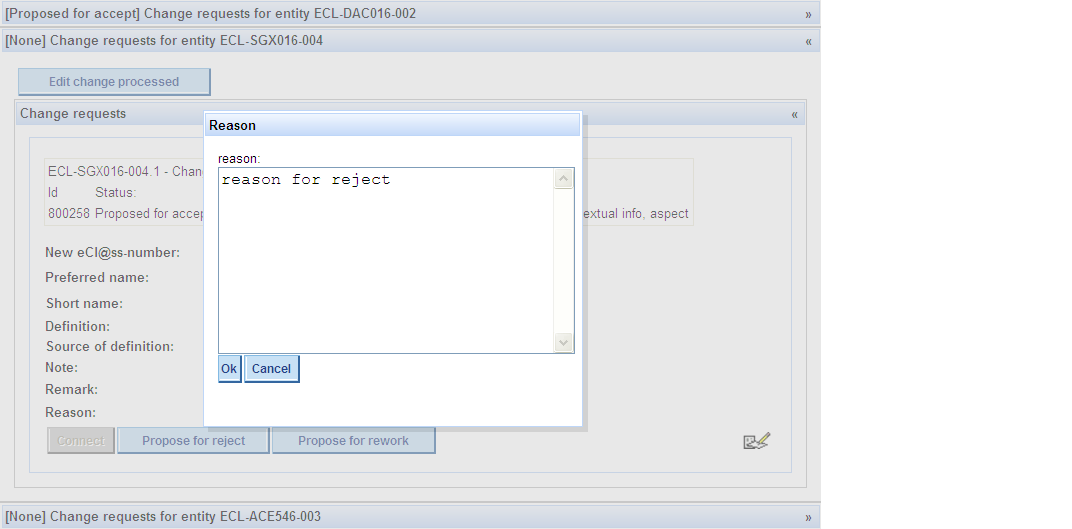 Enter the reason why you want to reject the CR in the field „Reason“ and press OK.