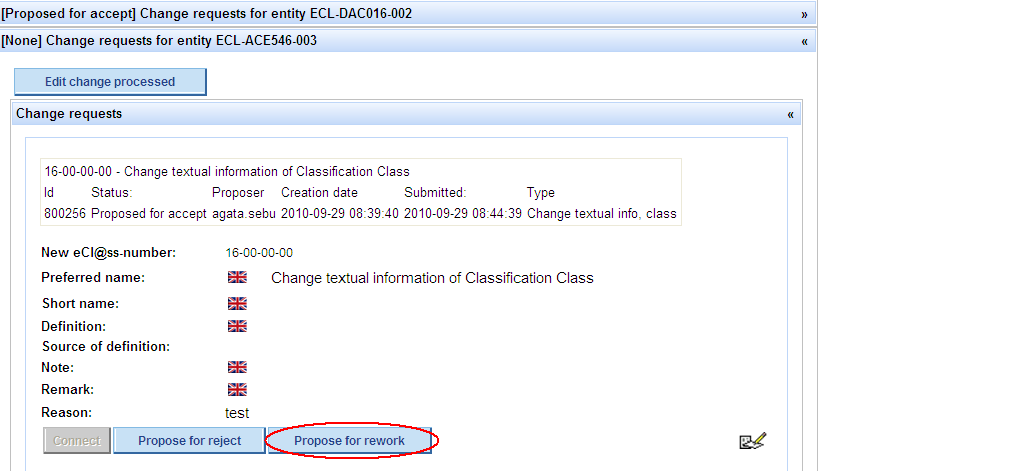 Propose CR for rework -> press button Propose for rework in order to propose the Change Request to be reworked