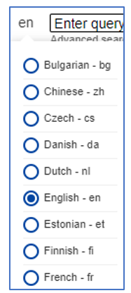 First of all, the user can change the language of the content by navigating the mouse to the button "en" which is left to search field. Various languages can be selected.