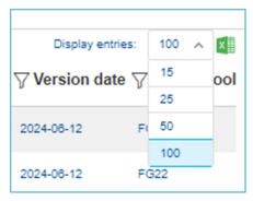 On the far-right side, the option to display up to 100 entries is available. Here the Excel icon allows to directly export in an Excel file the entries that are displayed on the page: