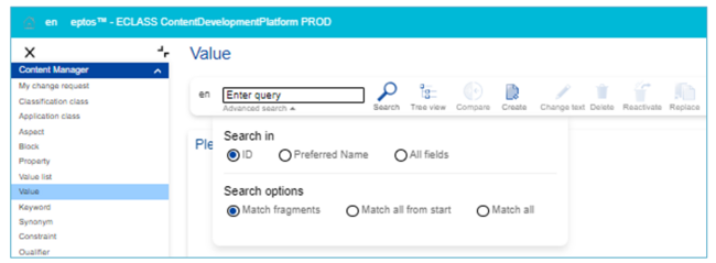 In the field Enter query it is possible to type in the ID or the preferred name of the Value.