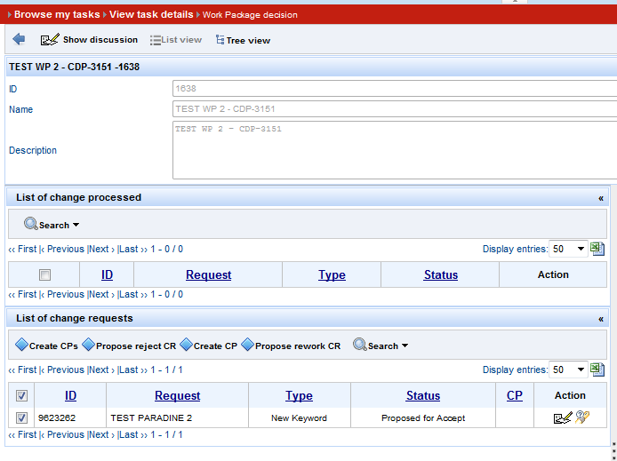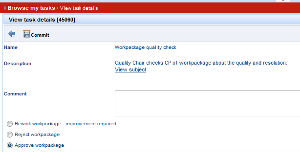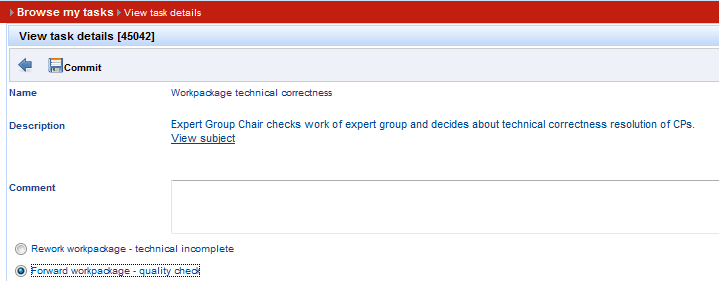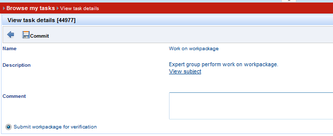 3. As soon as CP is created, return to Task details, via Back button. 4. Select radio button "Submit WP for verification" and press Commit button => new task is of type “Workpackage technical correctness” is created