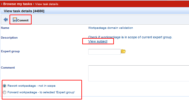 3. Select desired Expert Group. 4. User may either choose to Rework WP or Forward WP to selected Expert Group. 5. Select option Forward WP to Expert Group, click button Commit, in order to continue Major-Minor Process => Task of type “Work on work package” is created.