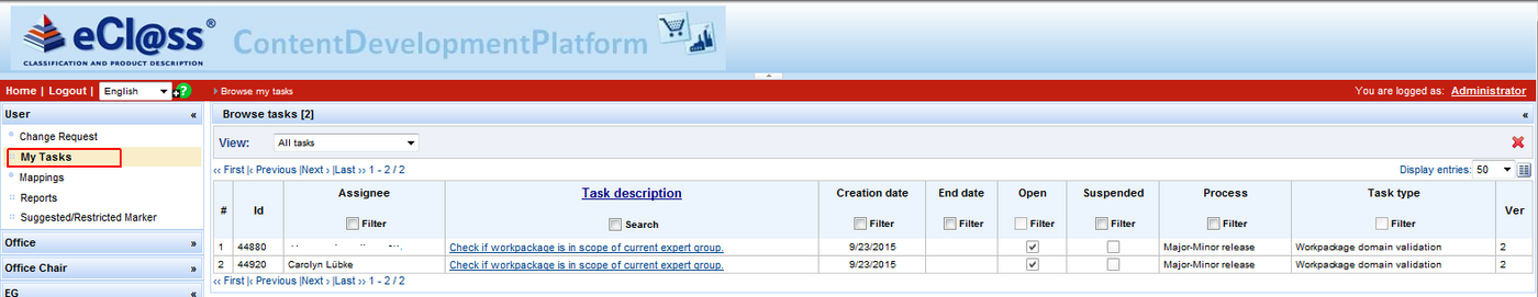1. Select menu entry User – My Tasks: