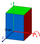 Original orientation | Rotation around x-axis in positive rotation direction | Rotation around y-axis in positive rotation direction | Rotation around z-axis in positive rotation direction |