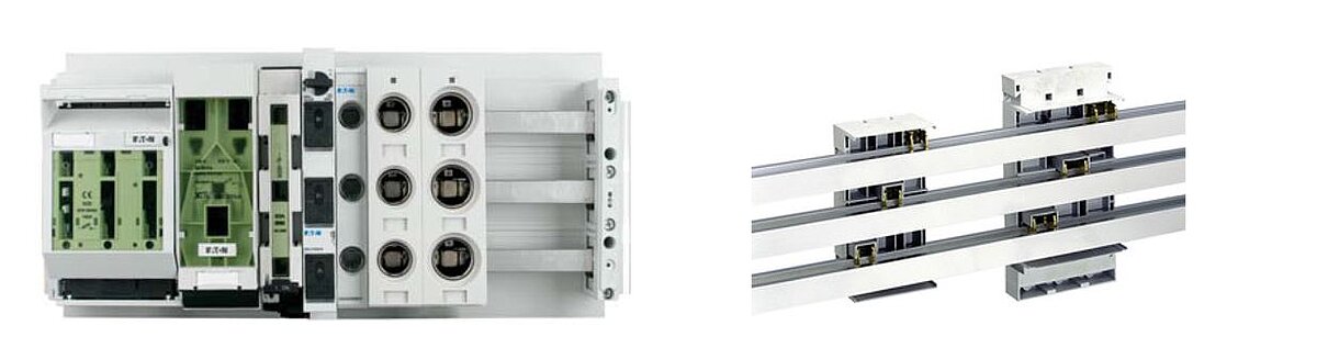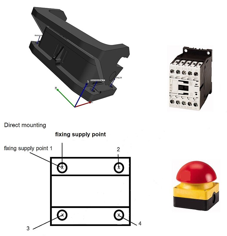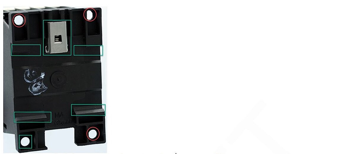 Below is an example of a device, such as a contactor, that provides both a bus bar fastening (green) and a screw mounting (red).
