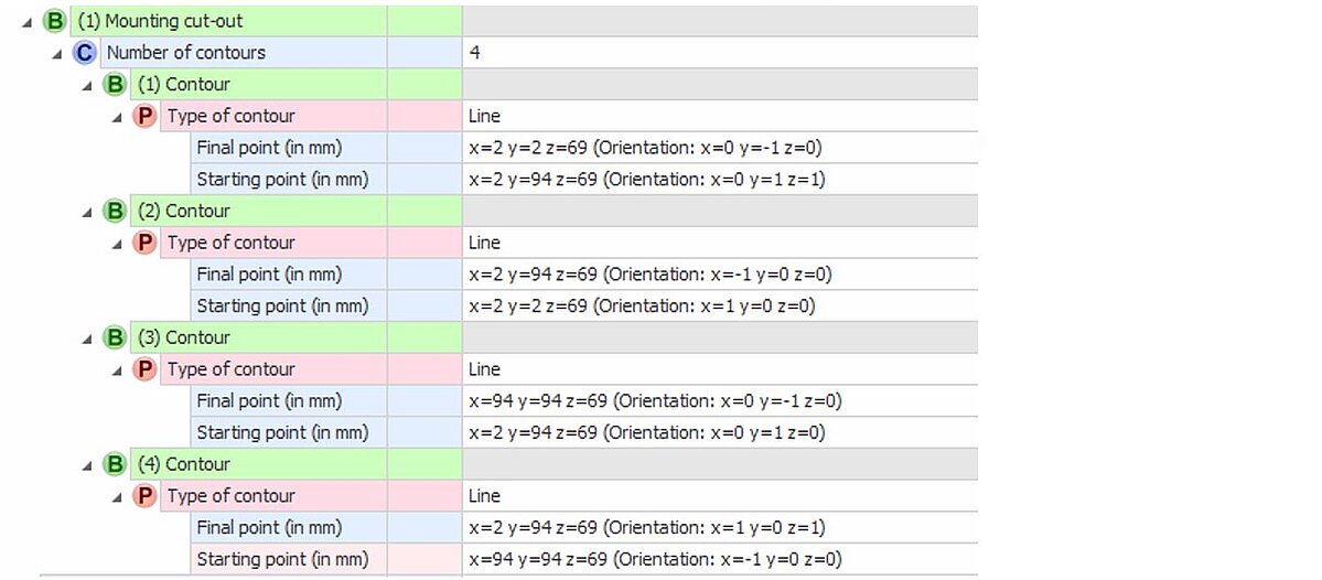 6 | M | Final point (in mm) | Coordinate of the final point of the line | Required for cut-out creation |