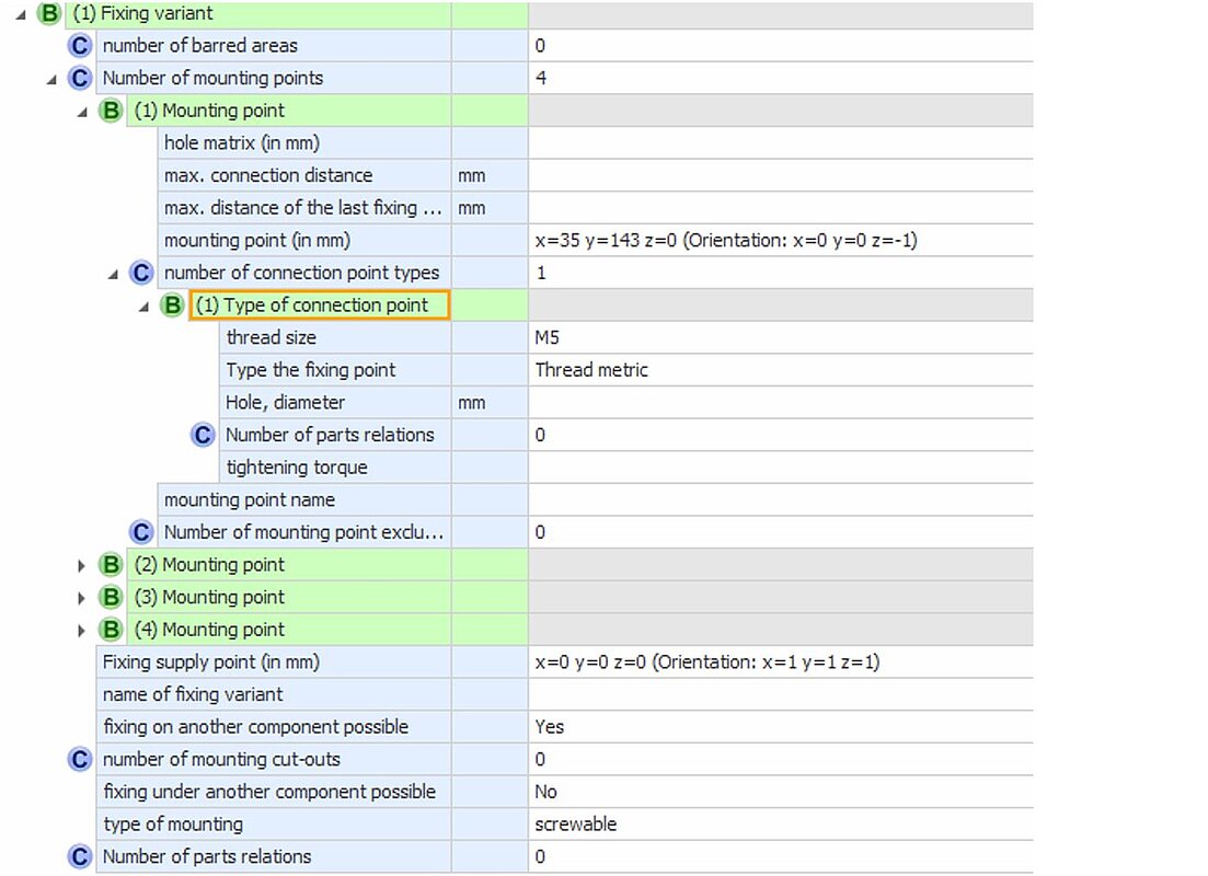 4 | M | thread size | Describes the thread size of the fixing point (value list) | Required for drilling automation to complete the thread To be filled only if type of connection point provides for "thread xxx" |