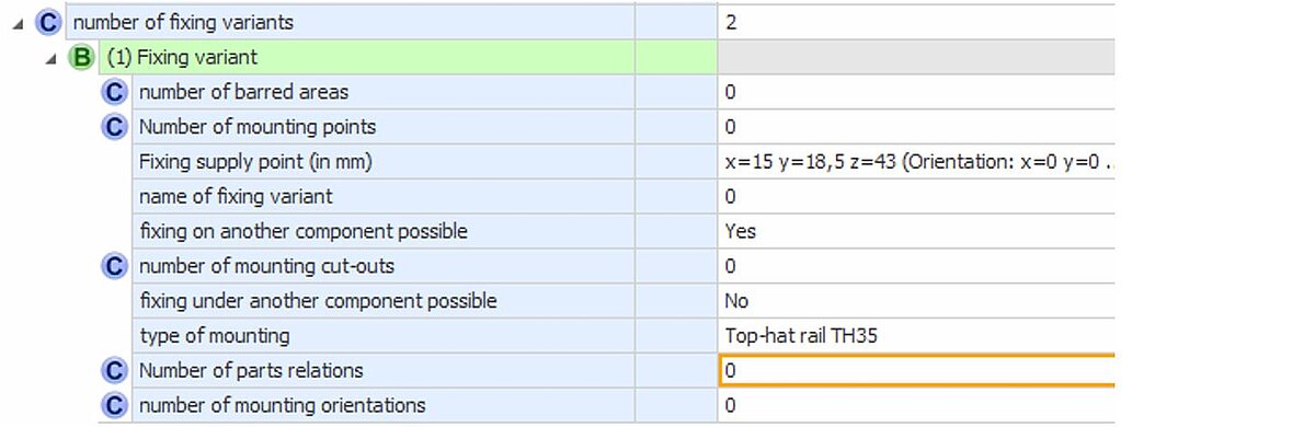 3 | M | name of fixing variant | Name of the fixing variant. For standard fixings with top-hat rails we recommend: TH15, TH35, TH75. For systemic fixing, please select alphanumeric names without spaces. | Helps with the allocation and arrangement of components |