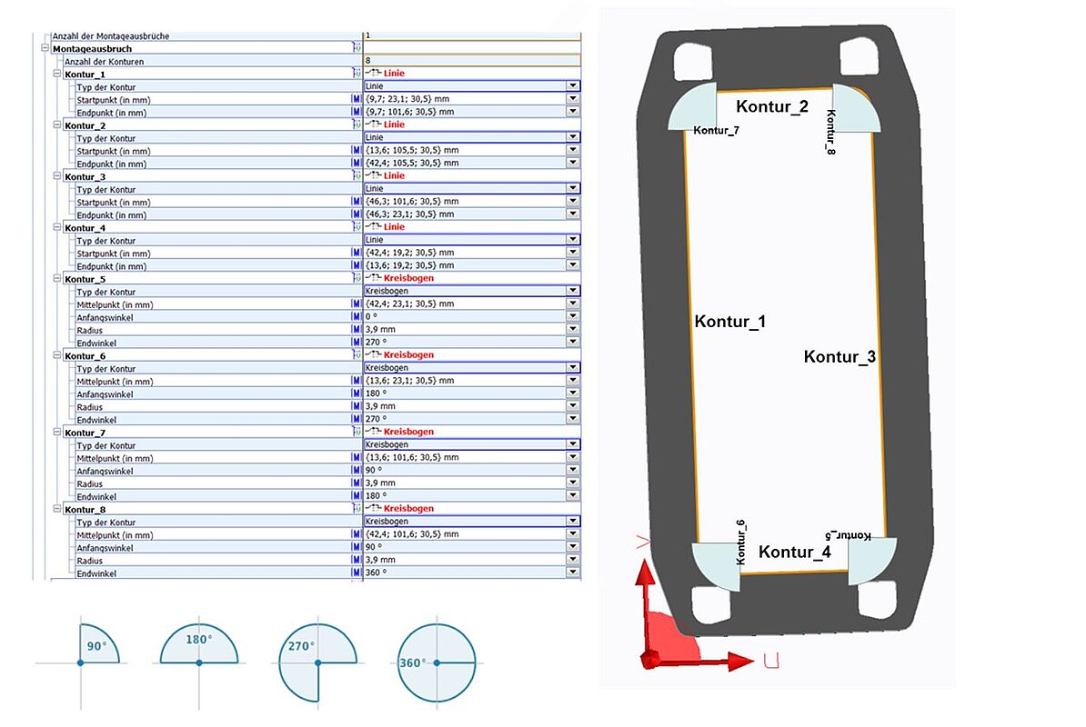 | Zero degree is "right" on the x-axis. The cut-out starts at the starting angle and runs counterclockwise to the end angle (polar coordinate system). |