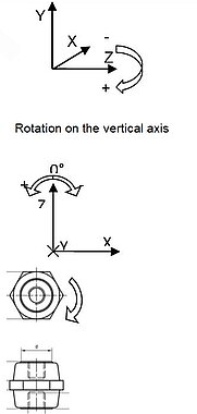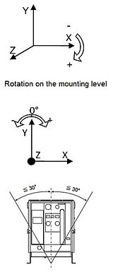 If the value=0° for all angles of rotation, the Y-axis of the mounting level stands vertically (perpendicular) in space, while the X- and Z-axes are horizontally aligned. Positive values then rotate the mounting level so that the X-axis tilts downward from the horizontal toward the vertical direction. |