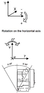 3 | M | Rotation on the vertical axis | Angle by which the mounting level is to be rotated around the Y-axis of the coordinate system. If the value=0° for all angles of rotation, the Y-axis of the mounting level stands perpendicular (vertical) in space, while the X- and Z-axes are horizontally aligned. Positive values then rotate the mounting level so that the X-axis rotates in the direction of the Z-axis. Note: Rotations in this axis are useful only if a rotation on the horizontal axis is taking place at the same time. |