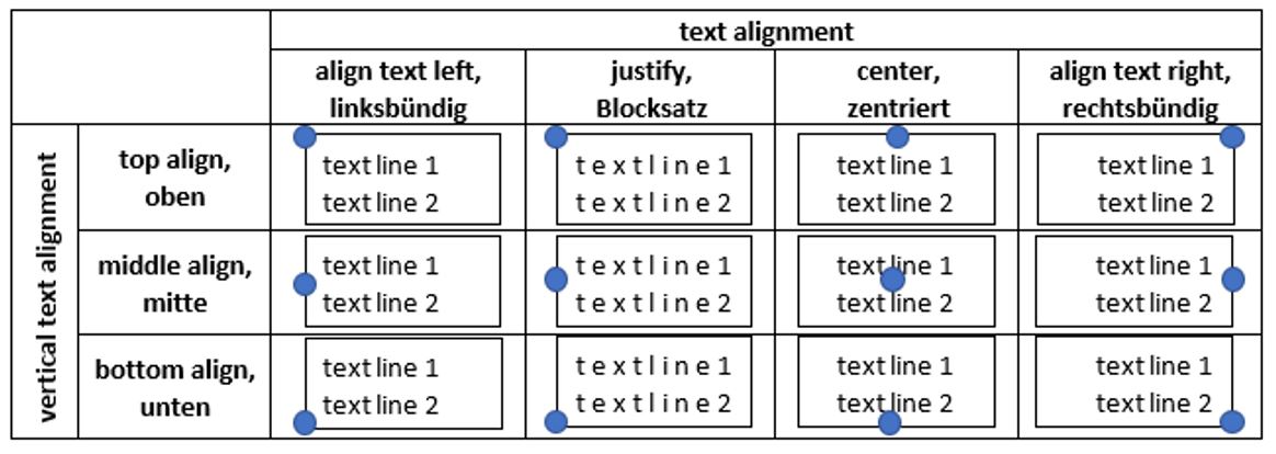 Overview of all combinations of text block orientations (blue dot shows insert position):