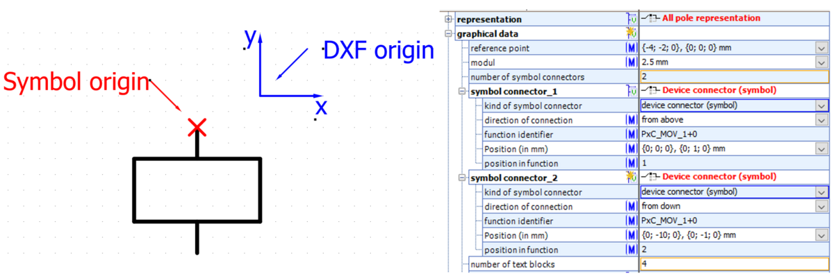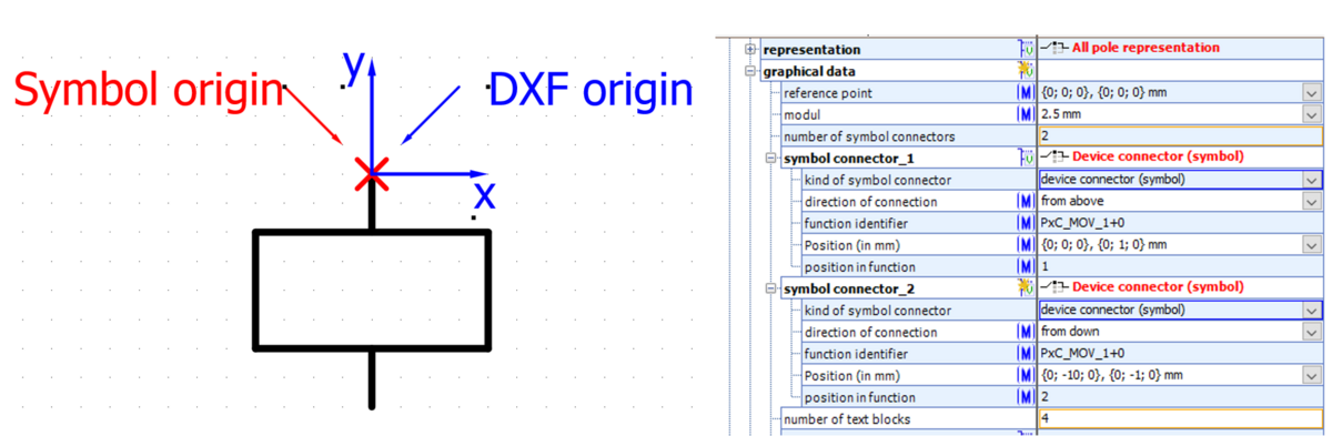 2 | M | Reference point | Serves to position the insertion point, and acts as reference point for describing the position of the graphical elements (symbol connectors and symbol text). | Enables the graphical elements to be correctly arranged by the CAx system. Important note! All symbol-connector and text-block coordinate are provided relative to this point! |