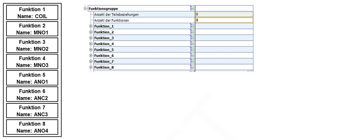 The functional description (see section 3.2 Fixing Variants) of the power contactor contains eight functions (Figure 42) – one function for the coil, one function each for each of the three circuit breakers and four functions for the auxiliary contacts.