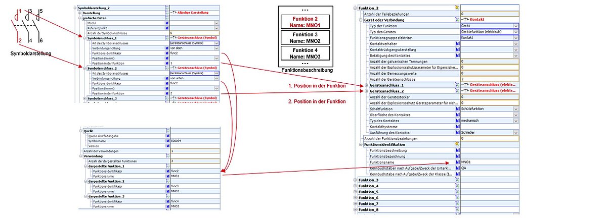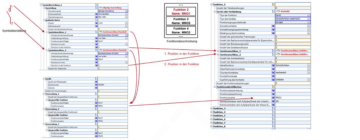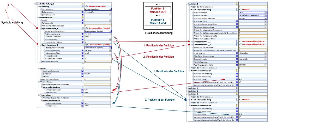 By once again using the example of the power contactor as a reference, the symbol representation for an auxiliary switch can also be explained in more detail. The two auxiliary switches involve two NO contacts, which are described using a single symbol representation. The symbol representation employed for the NO contacts is used twice, and thus represents exactly one function. Within the description of the item, it is used for two functions (ANO1 and ANO4). The reference from the symbol representation to the ANO1 function is marked in red in Figure 60, while that to the ANO4 function is marked in blue. Here too, the “function identifier” property with the value func5 is used only to provide a reference between the symbol connectors and the displayed function in the usage section.