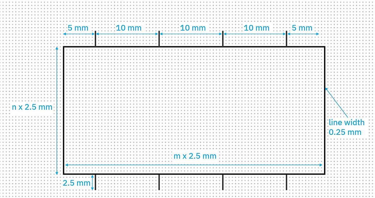 The distance from the "box" (contour of the graphic symbol), i.e. the connection line, to the positioning of the connection should also be 2.5 mm (this refers to the way the connections are led out so that they are not placed directly on the frame) DIN IN ISO 81714-1 Chapter 6.12.