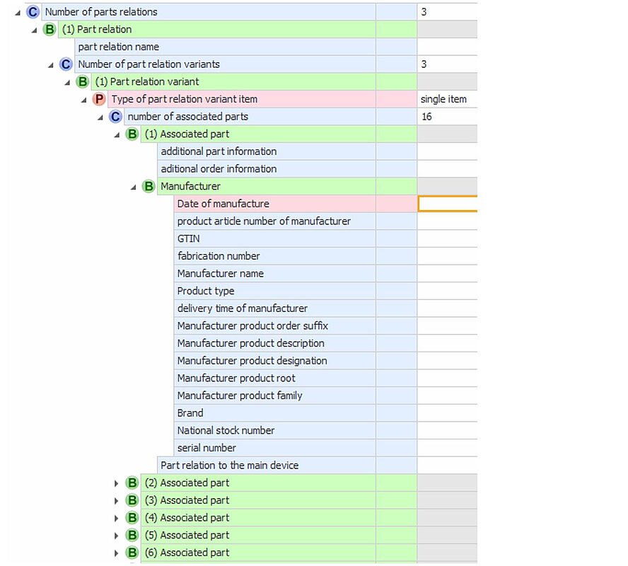 3 | M | Part relation name | Alphanumeric "systemic function identification" of the part relationship as a name. E.g. assigned protective agents for coordination 1 or 2 | Possibility to map additionally required articles or accessories via manufacturer-specific standardized function identifiers |
