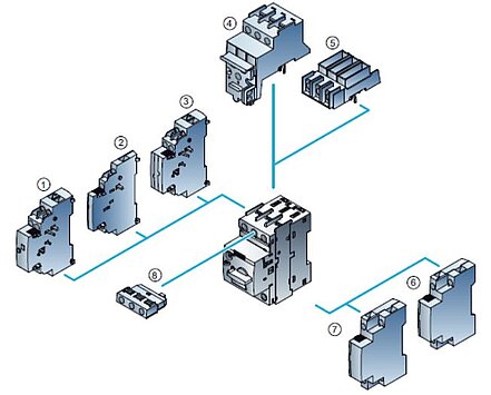 Circuit-breaker size S00 / S0 with attachable accessories | Parts list: 1 Signalling switch 2 Lateral auxiliary switch with 2 contacts 3 lateral auxiliary switch with 4 contacts 4 separator module 5 Terminal block Type E 6 Undervoltage release 7 Voltage release 8 Transverse auxiliary switch Dependencies: