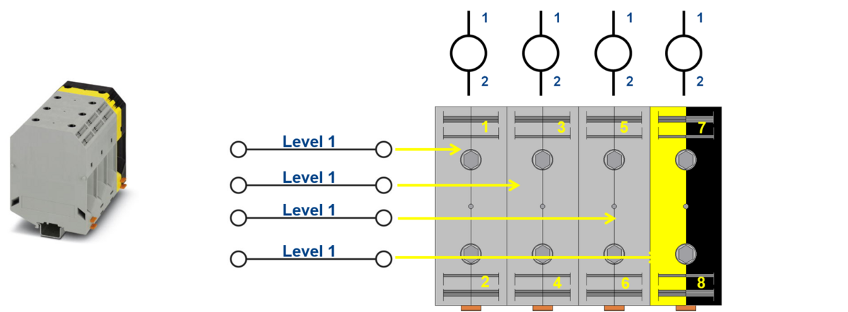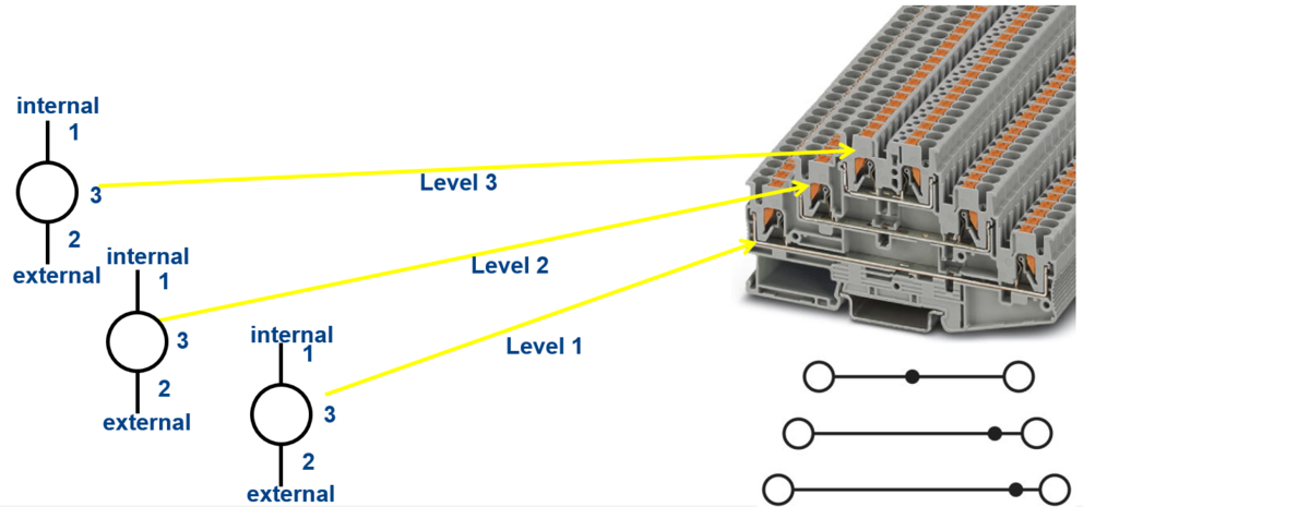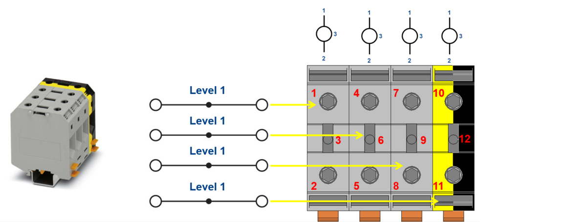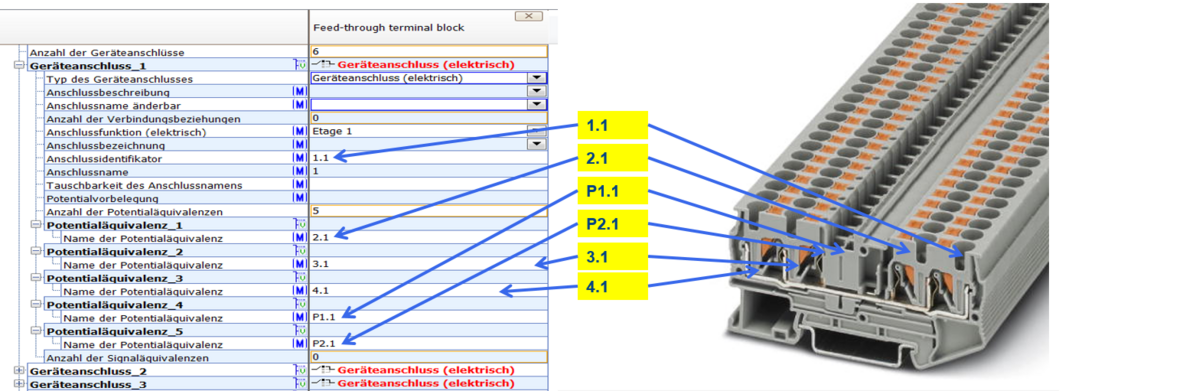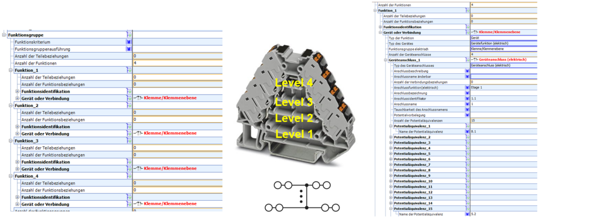 - For potential distribution terminals that have several levels, a function is specified for each level and referenced to all corresponding connections via the potential equivalence.