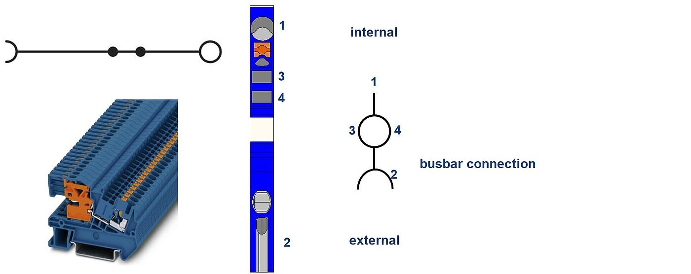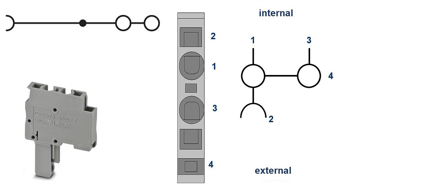 Feed-through terminal, 1 wire connection, 1 jack connection, 2 bridge connections