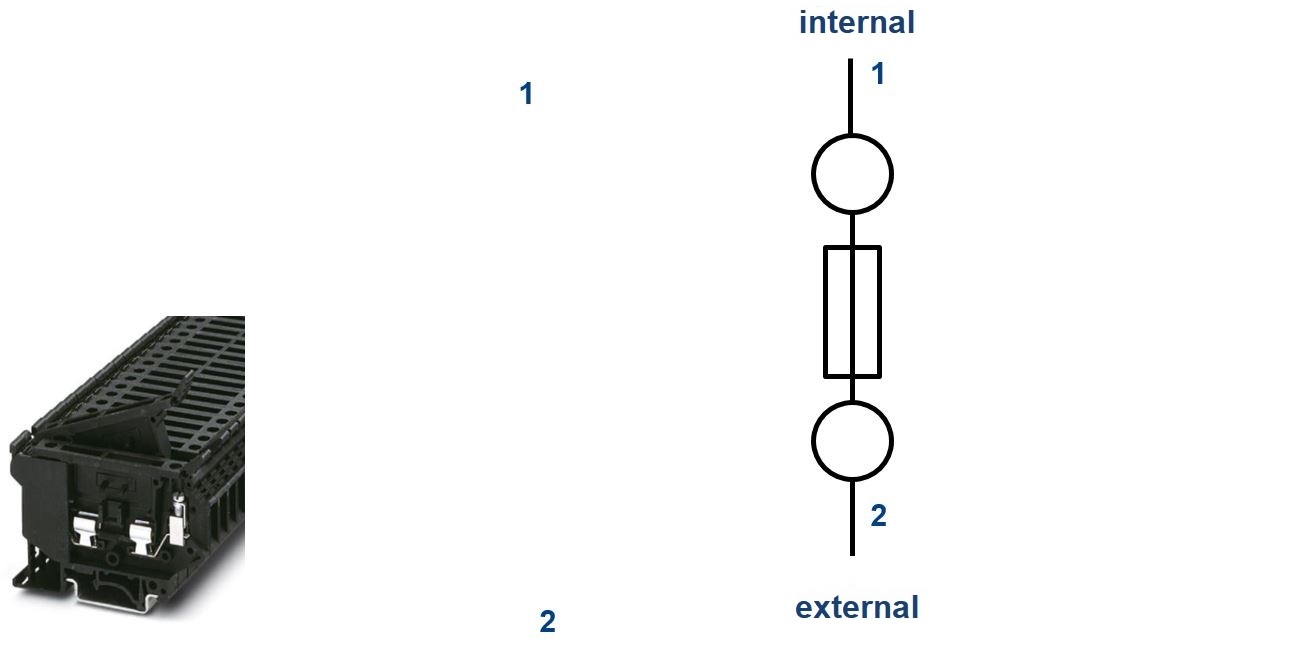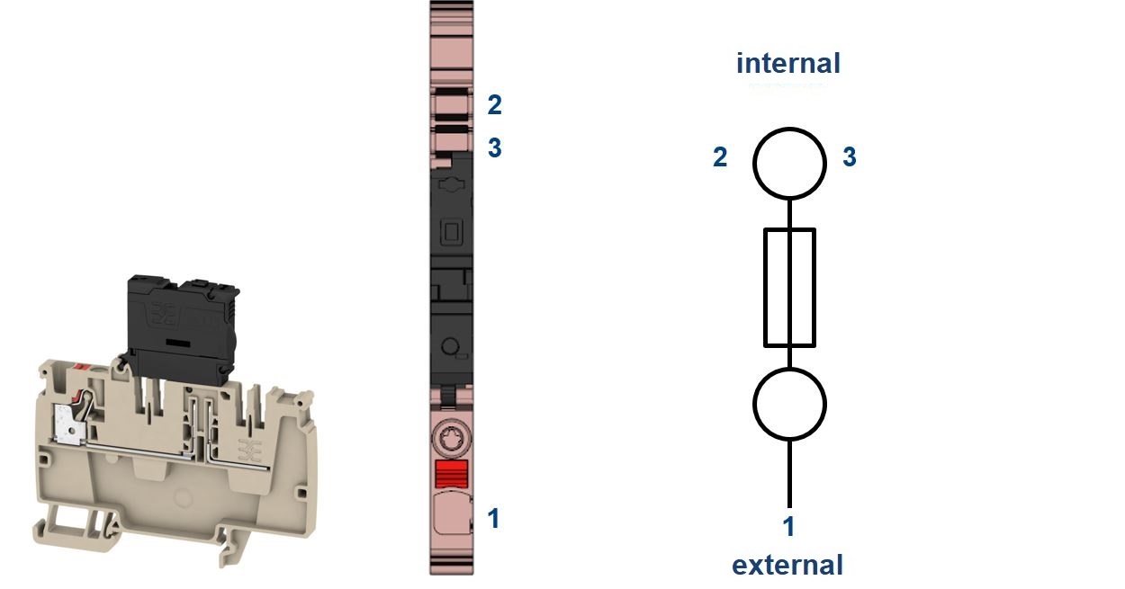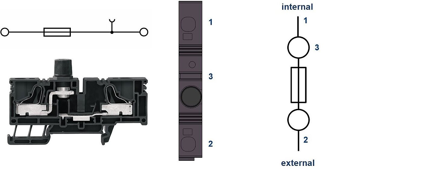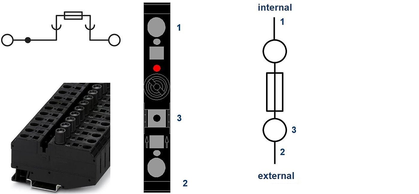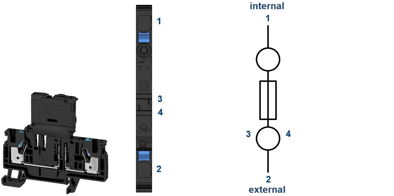 Terminal with fuse, 2 wire connections, 1 bridge connection