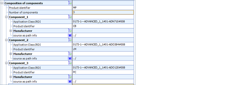To avoid adding product data twice a link to the ECLASS description of the component is used. This link ‘source as path info’ (STRING) can be an url or a filename with its path. While exchanging instance product data via a BMEcat file, the composition and all its com-ponents can be stored in one file. Then the string of the link is ‘../’.