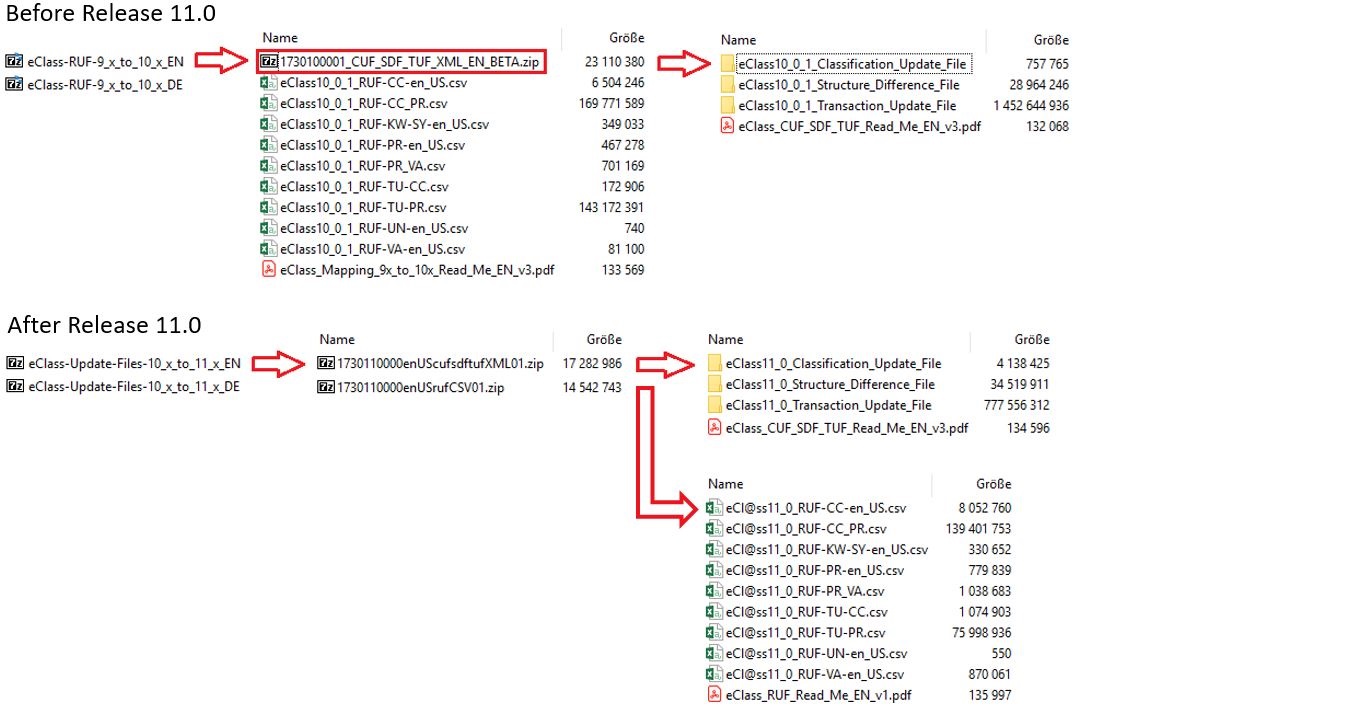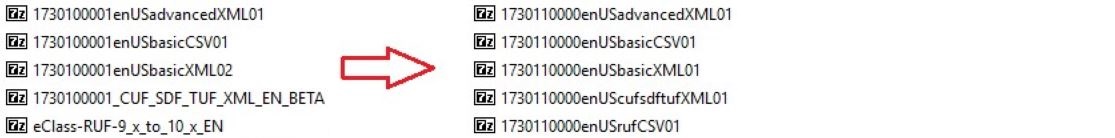 Starting from ECLASS Release 11.0 also, the naming of the Zip-files was aligned with the official naming rules of ECLASS, analogue to all other Release Deliverables. In Example 2 on the left hand side the old naming is visible, whereas on the right hand side, the new naming can be viewed.