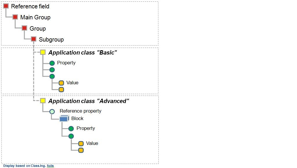 Property lists are compilations of individual features to describe individual commodities. In ECLASS, each subgroup (classification class at the fourth level) is described with the help of properties. The properties are not directly assigned to a subgroup but to a so-called application class which is connected to a subgroup. In the versions before ECLASS 6.0, ECLASS has used sets of properties that were directly assigned to a classification class - as it is still shown in the BASIC version. Application classes are only visible in the ADVANCED version.