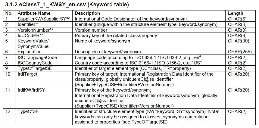 Keywords must not have exactly the same meaning as the preferred name of the classification class (e.g. class: pliers, keyword: pipe pliers). Keywords must not match the preferred name of the class they belong to. Keywords must not be too general in character (the keyword ‘school’ would be to vague for a class named ‘ballpoint pen’). Keywords are preferably to be entered in singular form. Keywords cannot be translated 1:1 and therefore vary in the ECLASS language versions.