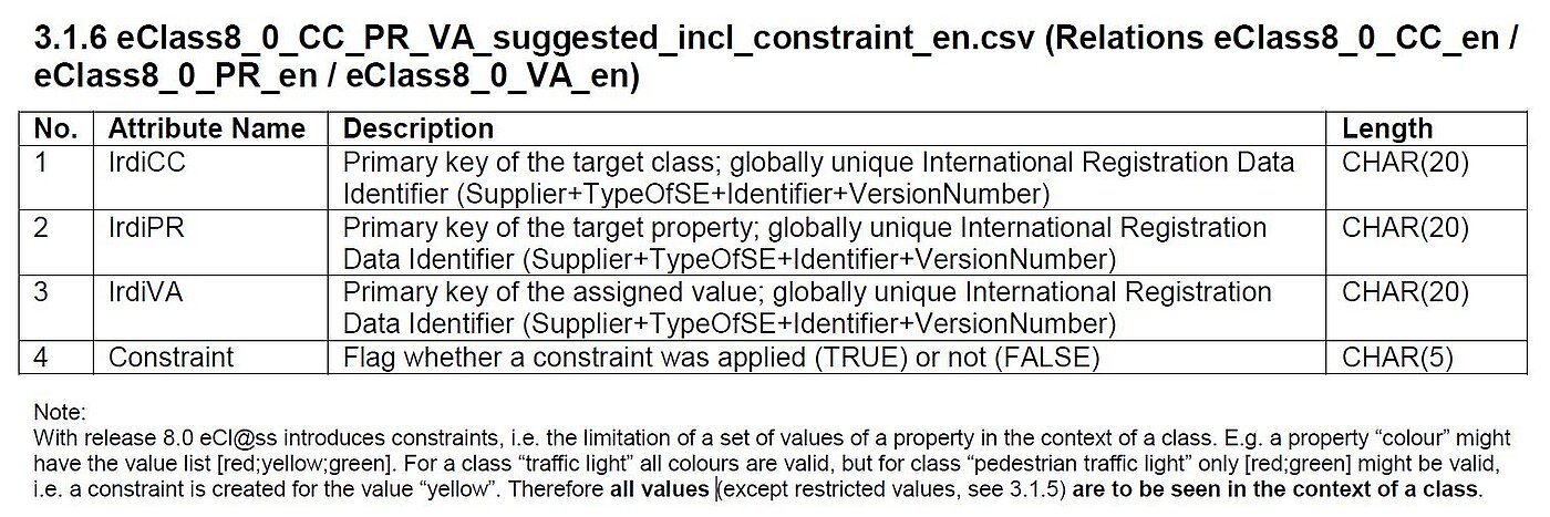 Prior to Release 8.0, ECLASS interpreted its value lists as open, i.e. as suggestions that were never intended to be exhaustive. As the ISO defines value lists as restrictive and exclusive ECLASS had to change its structure to be ISO-compliant. Therefore ECLASS now distinguishes between "restrictive value lists" (ISO view) and "suggested value lists" (proposed "open" lists that are not exhaustive). Because of this, most value that were noted until Release 6.2 are now marked as CLOSED as they are to be interpreted as restrictive. Correspondingly, all relations between properties and values in the context of a class listed in the value proposal file (eClass7_0_PR_VA_suggested_en_02.csv) are new, i.e. all relations listed in that file are interpreted as NEW and not published here again.